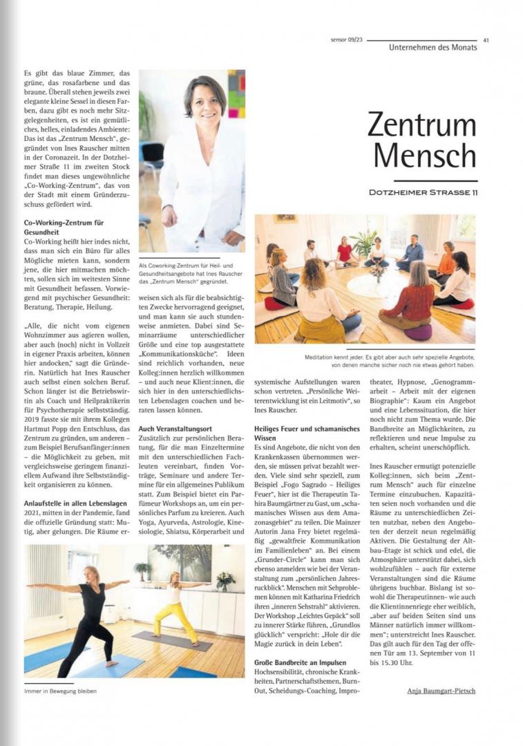 Artikel im Sensor Magazin zur Gründung vom ZENTRUM MENSCH
